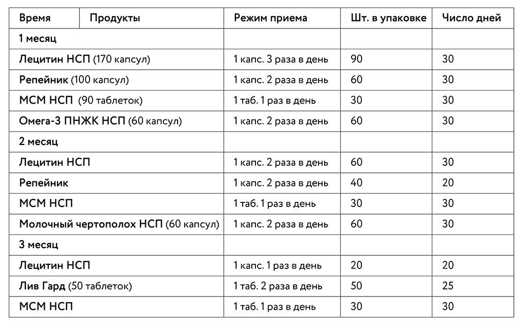 «Здоровье Вашей печени». Входящие в состав программы продукты улучшают и усиливают функцию печеночных клеток, стимулируют их регенерацию, уменьшают выраженность воспаления, а также улучшают жёлчевыделительную функцию печени. Лецитин и омега-3 ПНЖК относятся к числу наиболее важных мембранопротекторов, а также способствуют нормализации жирового обмена.