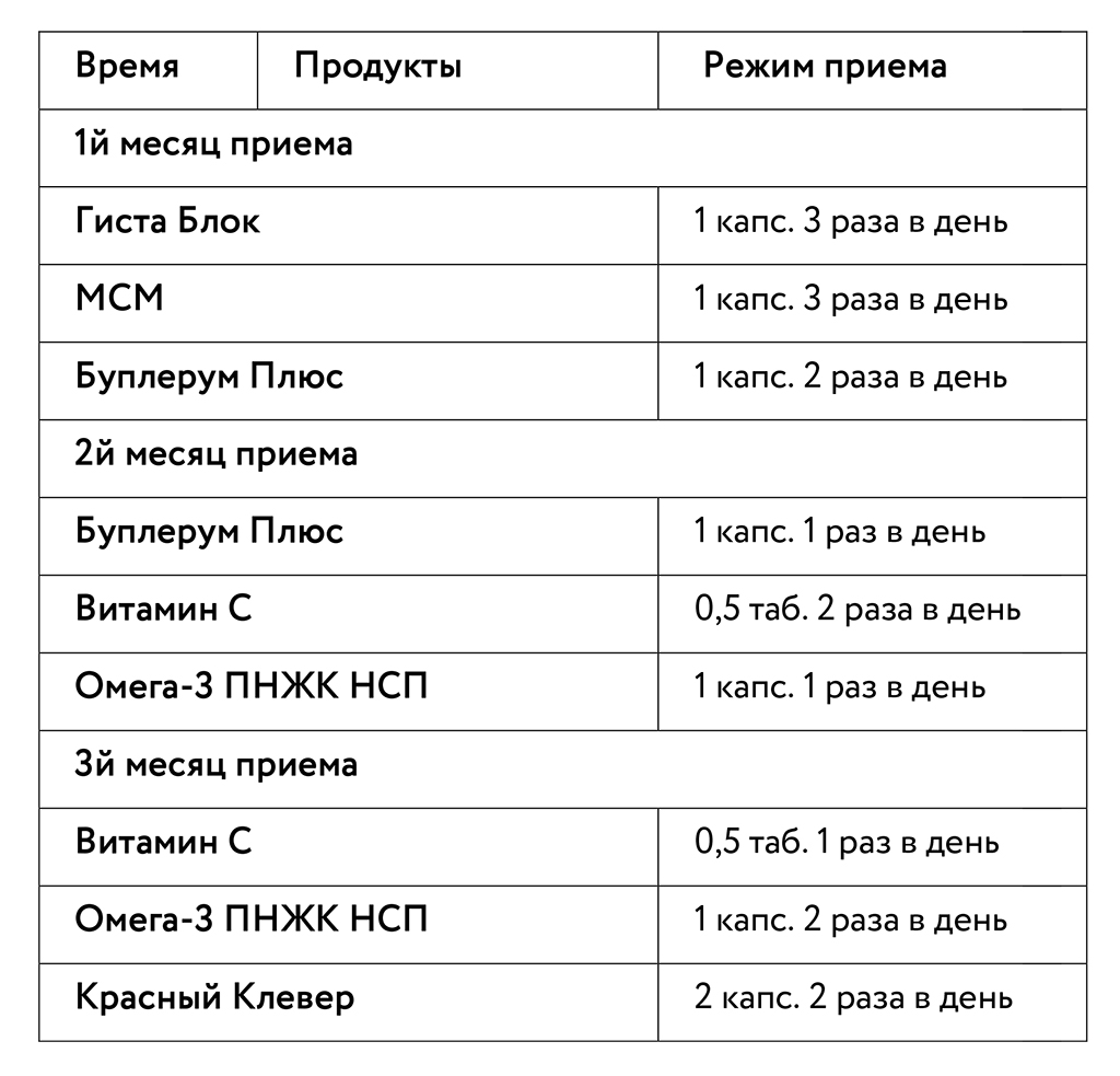 Опираясь на пищевые продукты и фитопрепараты, обладающие доказанным антиаллергическим действием, мы можем успешно противостоять различным формам аллергии. Предлагаем вашему вниманию комплекс «Стоп аллергия». Представленный набор включает шесть продуктов: Буплерум Плюс, Гиста Блок, Омега-3 ПНЖК НСП, МСМ НСП, Красный Клевер и Витамин С НСП. Эти продукты можно использовать в качестве базового набора, что не исключает включение в программу и других продуктов, усиливающих ее действие.