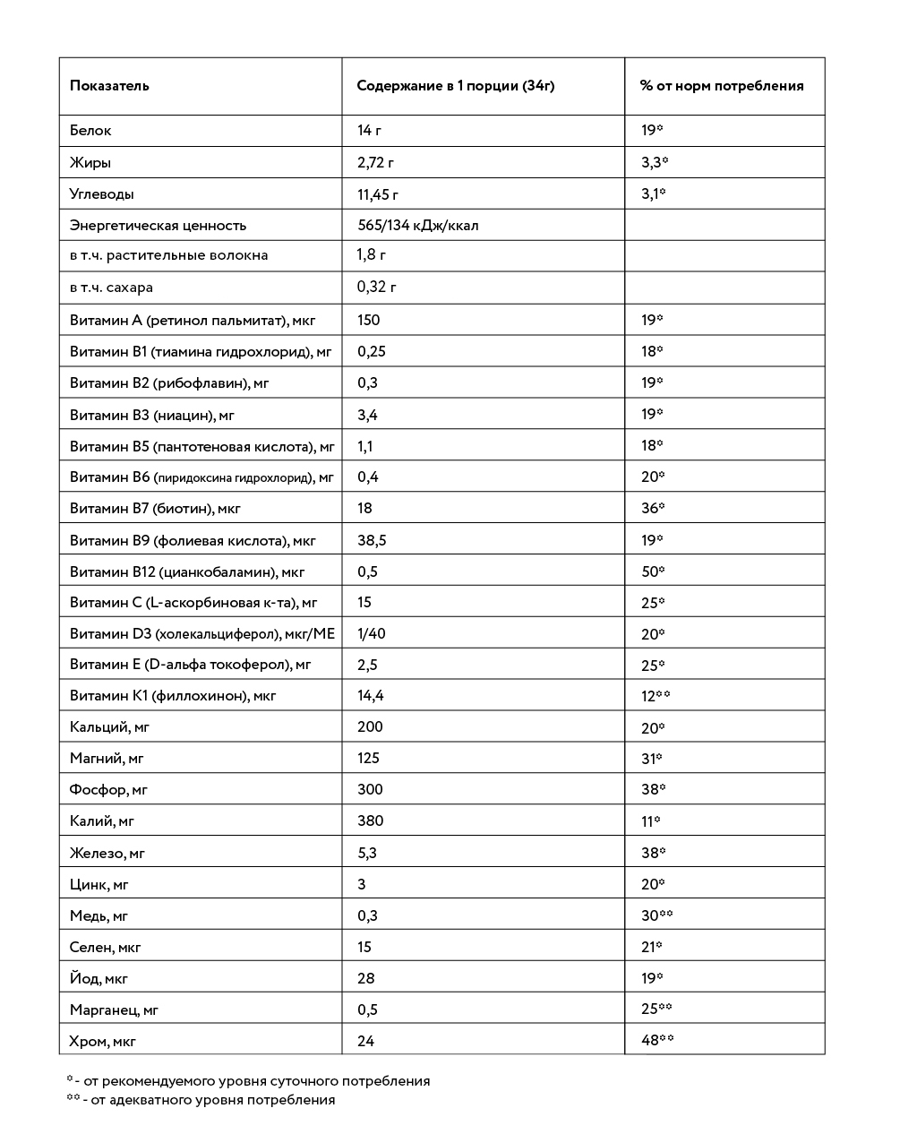 Ингредиенты: гороховый протеин, крахмал тапиоки, порошок подсолнечного масла, изолят нутового протеина, крахмал кукурузный, ароматизатор ванильный, кальция дифосфат, калия хлорид, загустители (ксантановая камедь, гуаровая камедь), рисовый протеин, порошок киноа цельнозернового, магния фосфат, кальция карбонат, натрия хлорид, магния оксид, подсластитель стевиолгли­козид, витаминный премикс Смарт Мил (мальтодекстрин, витамин С (L-аскорбиновая кислота), витамин Е (D-альфа токоферол), витамин В3 (никотинамид), D-биотин, пантоте­новая кислота (d-пантотенат кальция), витамин А (ретинол пальмитат), витамин В12 (ци­анкобаламин), витамин В6 (пиридоксина гидрохлорид), витамин D3 (холекальциферол), фолиевая кислота, витамин B1 (тиамина гидрохлорид), витамин В2 (рибофлавин), вита­мин К1 (филлохинон), мультиферментный комплекс (альфа-амилаза, протеаза, лактаза, липаза, целлюлаза), хрома пиколинат, железа фумарат, цинка цитрат, мальтодекстрин, калия йодад, марганца глюконат, натрия селенит, меди глюконат.