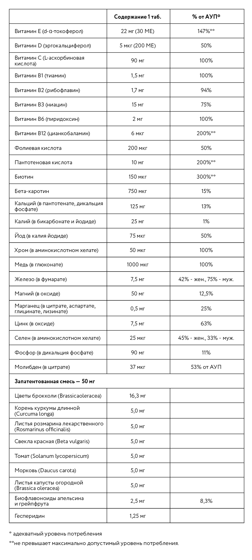 Уникальная витамино-минеральная формула, включающая фитоингредиенты и биофлавоноиды, усиливающие действие комплекса. Витамины и биоэлементы находятся в легкоусваиваемой форме.